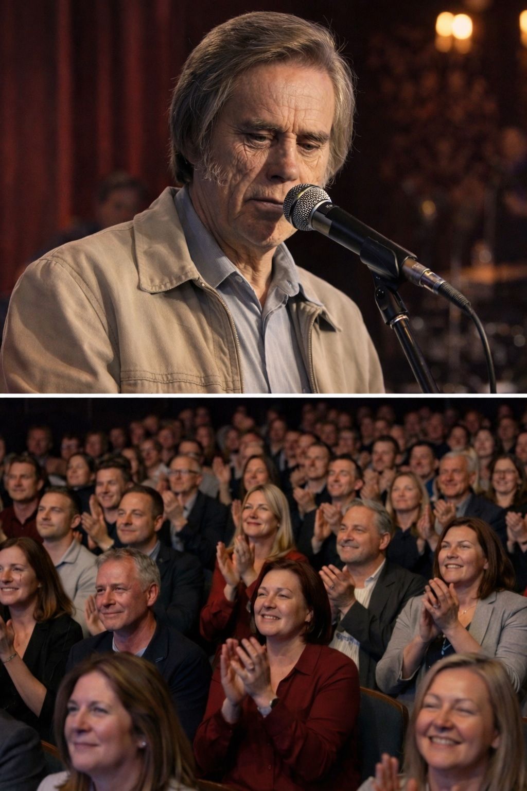 He did not greet the audience with easy humor. He did not attempt to win them back before he began. He simply stood there. For a second — maybe two — he looked like a man who knew exactly what people were thinking.