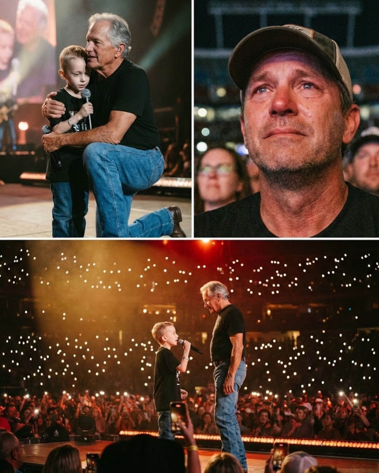 UNCLE GEORGE… CAN I SING WITH YOU JUST ONCE? AND AN ENTIRE STADIUM OF 20,000 PEOPLE FELL SILENT. A 6-YEAR-OLD BOY STOOD AT THE VERY EDGE OF THE STAGE. THIN. PALE. A HEART SUPPORT DEVICE RESTED AGAINST HIS CHEST. HE WAS WAITING FOR A NEW HEART. BUT WHAT HE ASKED FOR WASN’T A MIRACLE. HE ASKED GEORGE STRAIT JUST ONE QUESTION, HIS VOICE TREMBLING SO MUCH EVEN THE MICROPHONE SEEMED TO SHAKE WITH IT. GEORGE WAS 72 YEARS OLD. HE HAD STOOD ON THE BIGGEST STAGES IN AMERICA FOR MORE THAN HALF A CENTURY. HE COULD HAVE SIMPLY NODDED. HE COULD HAVE LET THE BAND HANDLE IT. BUT HE DIDN’T. GEORGE SET HIS GUITAR DOWN. HE WALKED OVER. HE KNELT UNTIL HE WAS EYE TO EYE WITH THE BOY. AND HE SPOKE SOFTLY, JUST LOUD ENOUGH FOR THE FRONT ROWS TO HEAR: “TONIGHT… THIS STAGE BELONGS TO YOU.” THERE WAS NO PLAN. NO REHEARSAL. NO NEED FOR PERFECTION. JUST ONE SMALL VOICE, ONE MAN WHO HAD NEARLY LIVED A LIFETIME, AND 20,000 GROWN ADULTS UNABLE TO HOLD BACK THEIR TEARS. THAT MOMENT WASN’T MEANT FOR THE CHARTS. IT BECAME WHAT MILLIONS WOULD LATER CALL THE PERFORMANCE OF A LIFETIME.