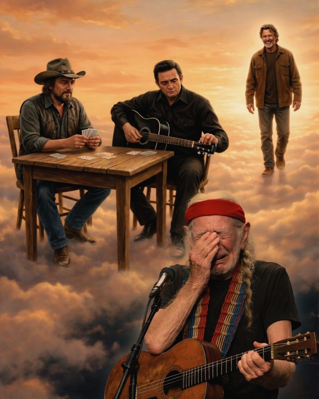 In the artwork, Waylon Jennings sat at a weathered wooden table among the clouds, dealing cards with the familiar ease of an old friend waiting for company. Johnny Cash adjusted the strings on his black guitar, calm and ready. In the distance, Kristofferson walked toward them, smiling with the relaxed confidence of a road veteran who knows the next set is about to begin.